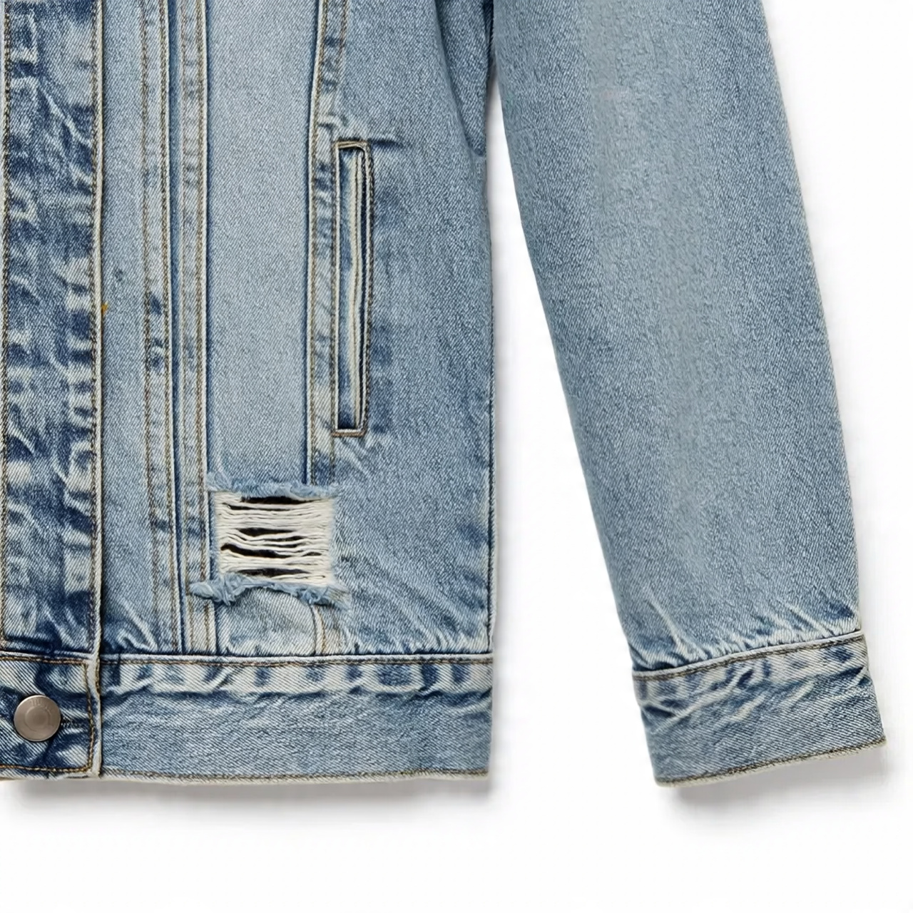 jeans jacket features a regular/slim fit that sits comfortably on the shoulders and chest without feeling tight. Designed with a structured denim fabric, it provides a sharp silhouette while allowing easy movement.